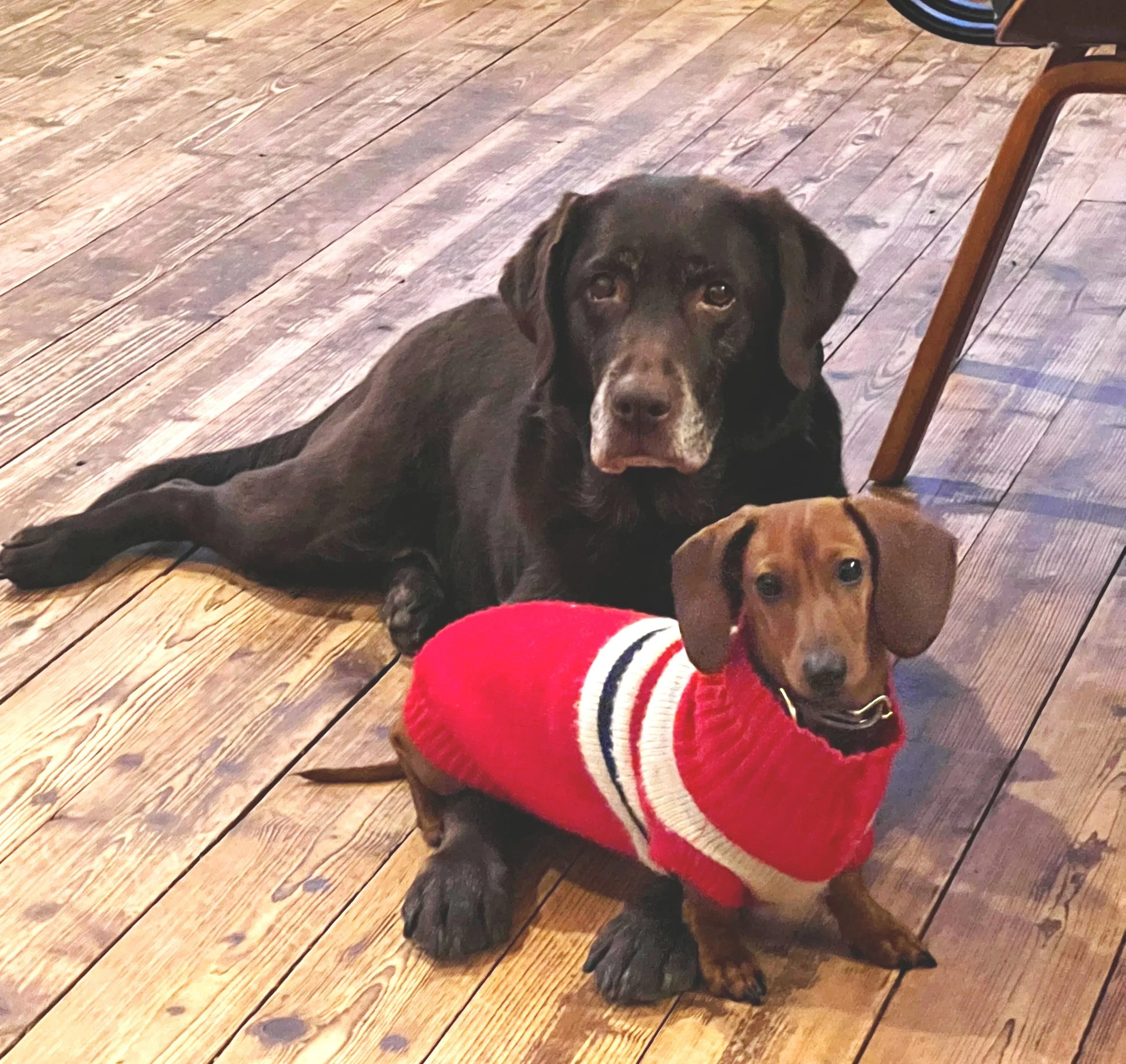 Labrador Bobbie en teckel Olijfje zijn de lijm die het kantoor bindt. Wanneer ze niet druk bezig is met schattig-zijn, zitten ze graag in stoelen te doen alsof ze geen hond zijn.